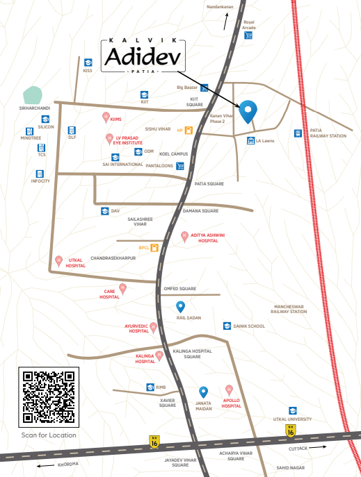 Located in Patia, Bhubaneswar, nearby landmarks include Pradyumna Bal Memorial Hospital, Kalinga Institute of Medical Sciences, and Patia railway station.